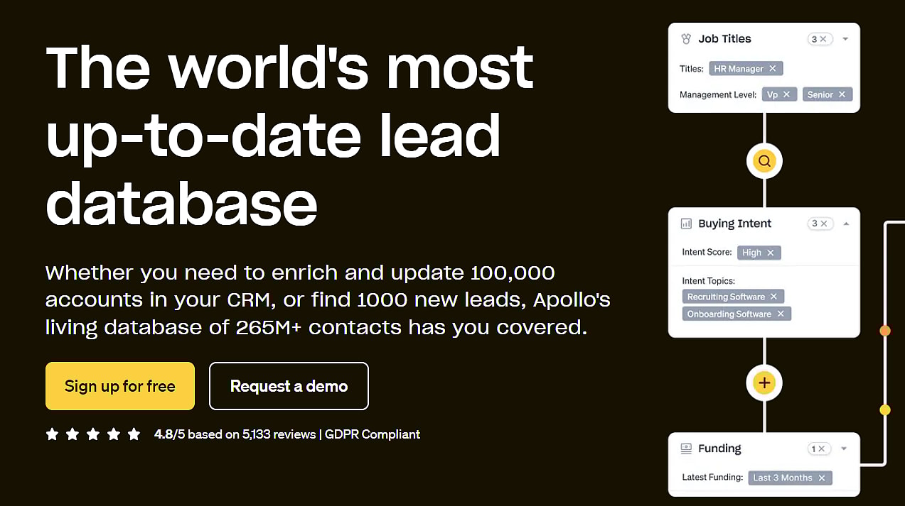 Apollo — это платформа вовлечения, основанная на данных, которая помогает торговым представителям выявлять возможности для продаж и повышать качество бесед с потенциальными клиентами. Программное обеспечение помогает отделу продаж или владельцам малого бизнеса проводить глубокую информационную работу, точно нацеливаться на потенциальных клиентов, выходить на них и привлекать их к сотрудничеству со скоростью и масштабом.