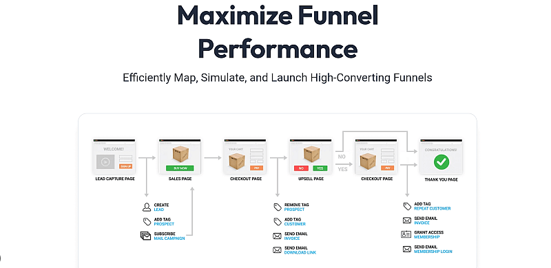 Получите продвинутый симулятор и картограф воронки с помощью Kartra и визуализируйте самодвижущиеся воронки за несколько минут. Он позволяет эффективно строить, тестировать и запускать воронки, чтобы быстрее конвертировать потенциальных клиентов в высококачественные лиды. Вы получите визуальный редактор с функцией перетаскивания, который позволит вам воплотить стратегию воронки на странице и нацелить потенциальные результаты на каждом этапе. Kartra позволяет просматривать триггерные правила для категоризации клиентов и максимизации продаж путем предоставления лучшего опыта для ваших клиентов. Он предлагает несколько вариантов интеграции, чтобы помочь вам создать страницы, окно оформления заказа, электронные письма и корзину всего за несколько кликов. С помощью диаграммы симулятора вы можете визуализировать активы, которые оказывают наибольшее влияние на ваш доход.