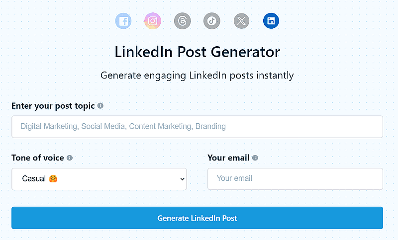 Этот инструмент попросит вас задать тему сообщения в LinkedIn, выбрать тон, и вот вы уже на месте. Ваш контент готов. Mention’s LinkedIn Post Generator — это самый быстрый и доступный инструмент искусственного интеллекта, который вы только можете найти.