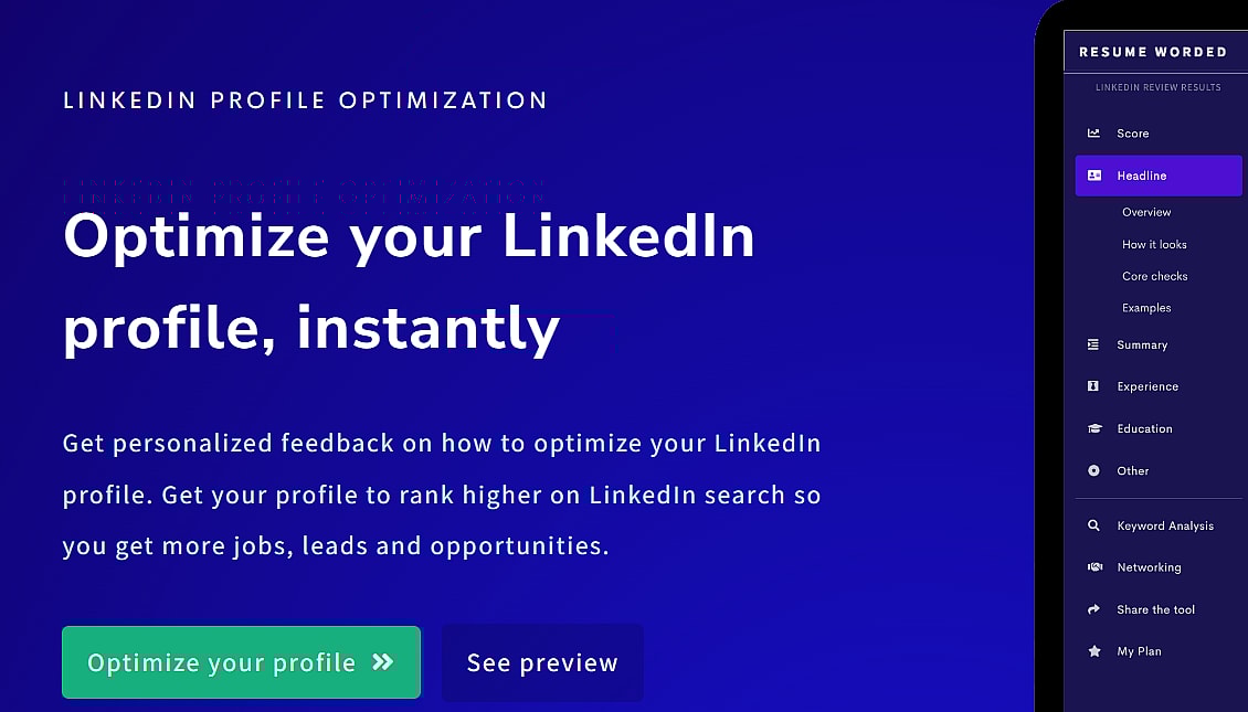 Если вы ищете бесплатный оптимизатор LinkedIn, Resume Worded сделает это за вас без каких-либо ограничений. Этот инструмент с искусственным интеллектом полностью управляет вашей презентацией в LinkedIn, начиная с ключевых слов и заканчивая написанием профиля. Вы можете положиться на этот инструмент во всем, что касается оптимизации профиля.