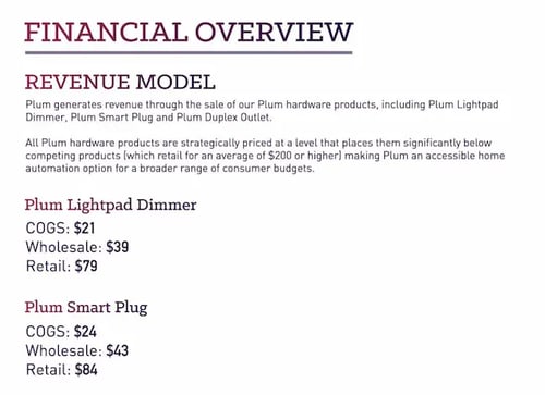 Мне нравится, что этот пример бизнес-плана начинается с обзора модели доходов компании, а затем показывает предлагаемые цены на ключевые продукты.