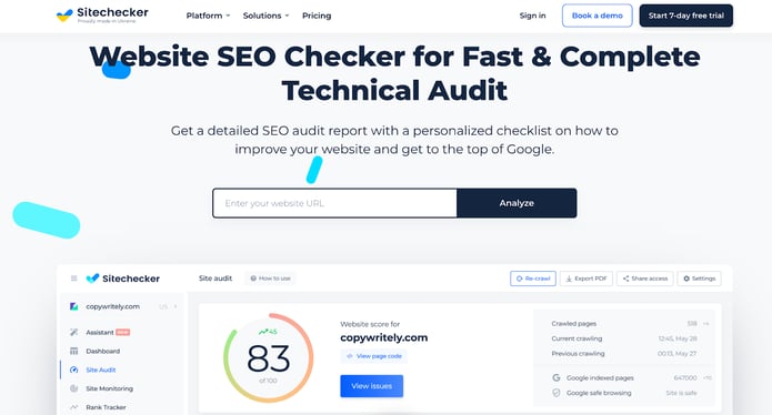 Seobility — это бесплатный инструмент для SEO-проверки. С его помощью вы можете проверить, насколько ваш сайт соответствует современным SEO-правилам. Мне нравится этот инструмент тем, что, когда вы введете свой URL, Seobility проанализирует ваш сайт и даст несколько советов по оптимизации сайта. Помимо подробного SEO-аудита вашего сайта, вы получите доступ к 1000 аудитов подстраниц, отчетам и оповещениям по электронной почте, а также мониторингу ключевых слов. Вот еще несколько возможностей, которые вы можете использовать при работе с Seobility: