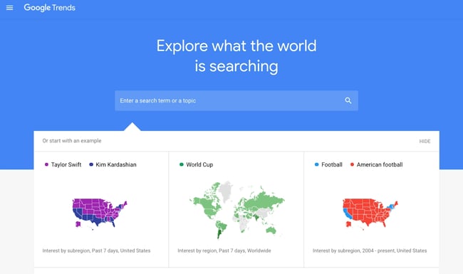 Традиционные инструменты SEO отлично подходят для проведения исследований и аудита, когда ваш бизнес уже устоялся. Но что делать, если вы начинаете новый бизнес и хотите узнать, какие популярные отрасли, темы и идеи изучают люди? Google Trends — отличное место для изучения неиспользованного потенциала, который может дать большой ландшафт ключевых слов для вашего сайта. Обратите внимание, что Google Trends — это не то место, где вы получите подробные данные. Я считаю, что этот инструмент лучше всего работает, когда вы используете его как компас для определения направления вашей SEO-стратегии, а затем объединяете эти данные с более надежным программным обеспечением, таким как SEO Marketing Tool от HubSpot. Вот что следует искать в Google Trends: