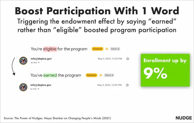 Представьте, что вы написали письмо, которое настолько эффективно, что позволило вам получить работу в Белом доме. Именно это произошло с Майей Шанкар, доктором наук, специалистом по когнитивной нейробиологии. В 2014 году Департамент по делам ветеранов попросил ее помочь увеличить количество подписчиков на их программу льгот для ветеранов. У Майи был план. Она хорошо знала о когнитивном предубеждении, которое влияет на всех нас, — эффекте наделенности. Это предубеждение предполагает, что люди ценят предметы выше, если они им принадлежат. Поэтому она изменила тему письма о зачислении ветеранов. Ранее она гласила: