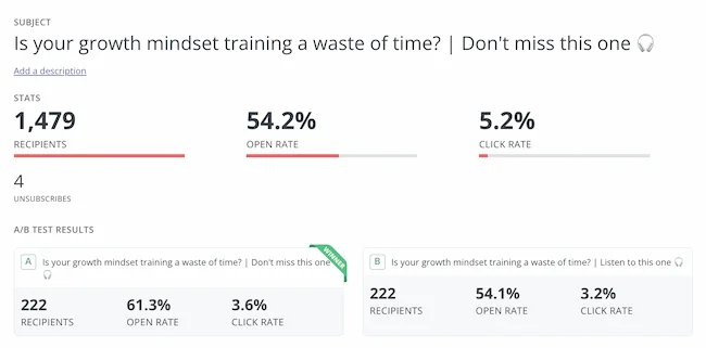 В целом люди любят следовать за массами. Выбирая блюдо, мы часто отдаем предпочтение самому популярному. Выбирая фильм для просмотра, мы, как правило, выбираем кассовый хит. Это хорошо известное психологическое предубеждение, называемое социальным доказательством. Мне всегда было интересно, работает ли это для электронных писем. Поэтому я провел A/B-эксперимент с двумя темами. Обе рекламировали мое шоу, но одна содержала социальное доказательство. Контрольное чтение: New Nudge: Почему бренды должны выставлять свои недостатки напоказ Вариант социального доказательства читать: New Nudge: Почему бренды должны выставлять свои недостатки напоказ (100 000 скачиваний) Я надеялся, что, отметив большое количество скачиваний этого эпизода, я побужу больше людей послушать его. К счастью, это сработало. Процент открытия увеличился с 22 до 28 % для версии с социальными доказательствами, а процент кликов (количество людей, которые действительно прослушали эпизод) удвоился.