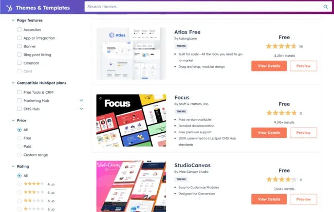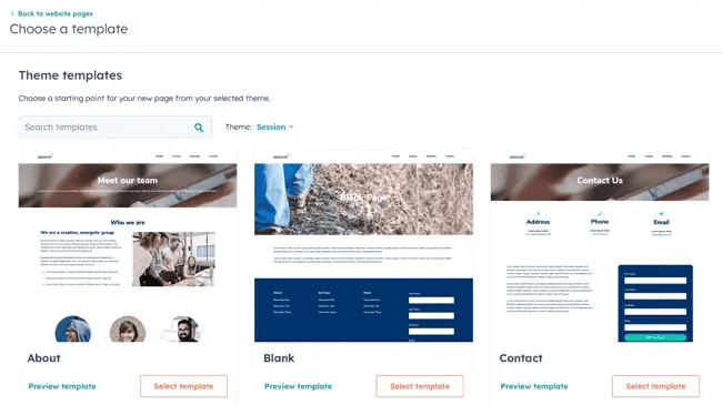 После того как вы создадите свою первую страницу, процесс станет простым и привычным. Вы можете выбрать шаблон, но не забудьте сначала установить тему (это часть процесса настройки). Бесплатные темы и шаблоны очень хороши, а рынок HubSpot предлагает множество вариантов. При этом большинство тем ориентированы на бизнес; если вы хотите создать художественный или эклектичный сайт, другие конструкторы сайтов предлагают более «веселые» дизайны.