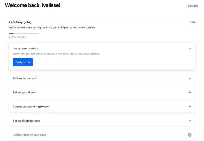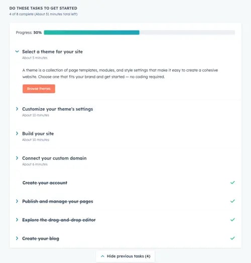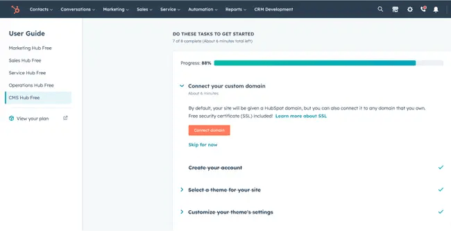 Я использую конструктор сайтов HubSpot (внутри CMS Hub) в качестве маркетолога по контенту в команде блога HubSpot и применяю его для двух своих сторонних проектов сайтов. Это один из лучших бесплатных конструкторов сайтов — не только из-за простоты регистрации, но и потому, что в него встроены инструменты для выполнения ряда других функций, таких как маркетинг и продажи. Процесс создания сайта настолько прост, что с ним справится любой — главным образом потому, что панель настроек включает интерактивный контрольный список, с помощью которого вы сможете шаг за шагом создать свой сайт. Мне нравился этот процесс регистрации, когда я создавал несколько сторонних проектов. Это один из лучших вариантов с точки зрения удобства для пользователей и новичков.