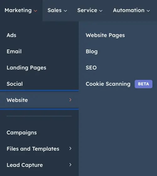 Теперь пришло время отредактировать наш сайт. Процесс редактирования сайта немного более разделен, чем в других инструментах. В других компаниях вы можете сразу перейти к редактору страниц, но в HubSpot вы перейдете на всю панель управления комплексом, что позволит вам получить доступ к инструментам маркетинга, продаж и обслуживания в дополнение к инструментам веб-сайта (расположены в меню «Маркетинг»).