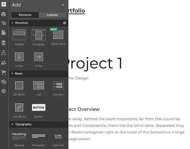 Однако сам конструктор страниц довольно привычен. Вы можете добавлять HTML-элементы, такие как секции, контейнеры, divs, списки, кнопки, заголовки и так далее. Инструмент включает в себя более технический язык, поэтому вы можете встретить такие термины, как «V Flex», что означает вертикальный флексбокс. Я вижу, что это сложно для начинающих и даже промежуточных пользователей, так что если вы относите себя к таковым, вам лучше выбрать другой инструмент. (Или вы можете использовать Webflow для изучения терминов веб-разработки!)