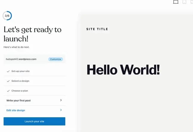 Темы современные и оптимизированные для мобильных устройств — я с удивлением обнаружил, что мне нравится довольно много дизайнов. Когда я пользовался WordPress в прошлом, я находил темы недостаточно яркими, но, похоже, компания обновила свою библиотеку. После этого WordPress переведет вас к сокращенному контрольному списку, похожему на список HubSpot. К тому времени, когда вы выберете тему, вы уже выполните первые три шага. Все, что вам нужно сделать, — это опубликовать первую запись в блоге, отредактировать дизайн сайта и запустить его.