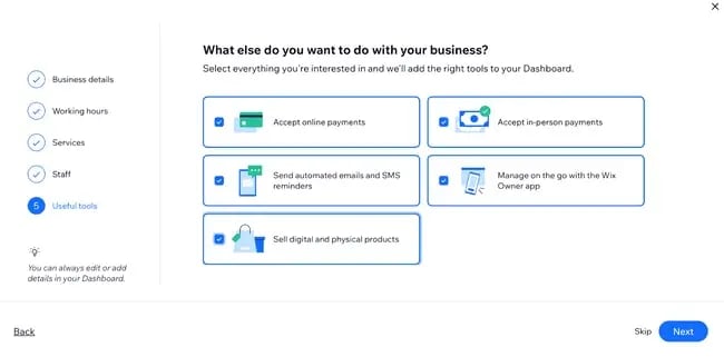 В зависимости от ваших ответов на некоторые вопросы анкеты, Wix включит в вашу приборную панель различные виджеты, инструменты и пункты контрольного списка. Например, ниже я указал инструменту, что хочу принимать платежи онлайн и лично, отправлять автоматические электронные письма и многое другое.