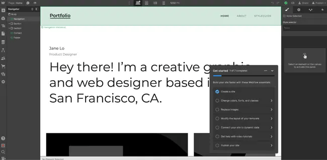 Выбрав тему, вы сразу же перейдете к конструктору сайтов. Конструктор страниц Webflow сложный, и кривая обучения очень крутая. Хотя инструмент включает в себя контрольный список настроек, он не так прост, как другие в этом списке. Например, вам сразу же предложат изменить классы CSS, что может быть нелегко, если вы новичок в веб-разработке.