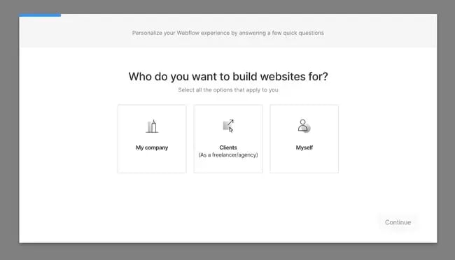Webflow — это фантастический бесплатный конструктор сайтов для тех, у кого есть опыт кодирования и кто хотел бы получить более настраиваемый инструмент для создания сайтов. Благодаря возможности включать несколько рабочих пространств и несколько веб-сайтов для клиентов, я особенно рекомендую его для веб-разработчиков-фрилансеров и агентств. (А если вы являетесь поклонником Adobe Creative Cloud, вы обнаружите, что Webflow имеет схожий UX — еще один плюс). Webflow является победителем, когда речь заходит о процессе настройки. Сразу же у вас будет возможность создать сайт для своей компании, клиентов или себя. Я выбрал «Клиенты», чтобы проверить его возможности для фрилансеров и агентств.