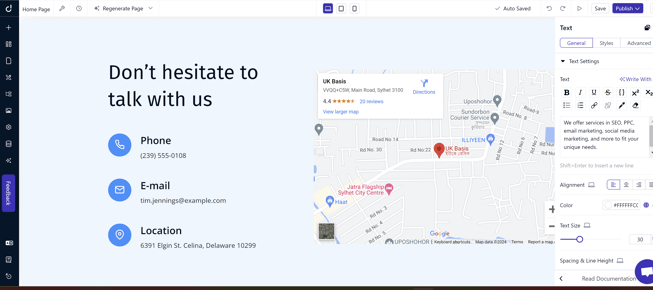 Если я прокручу страницу чуть дальше, то найду место для нашего местоположения и контактной информации. Конечно, Dorik предоставляет боковую панель с инструментами для настройки и редактирования сайта по своему вкусу.