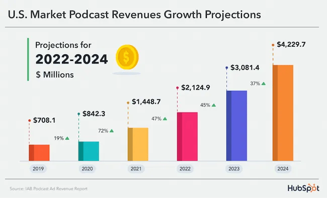 Аудиоконтент, например подкасты, стал бесценным активом как для маркетологов, так и для брендов. Согласно данным IAB, в 2024 году доходы рынка подкастов превысят 4,2 миллиарда долларов: