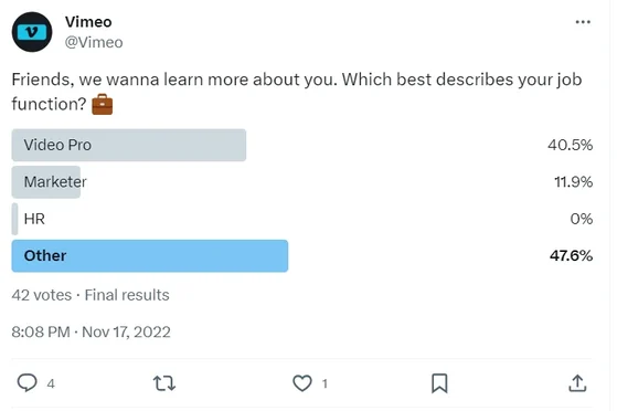 Несколько лет назад я пришла на семинар по йоге, потому что хотела пообщаться с единомышленниками, которым тоже нравилось заниматься йогой. Другими словами: Я хотел найти сообщество, ориентированное на мои интересы. Точно так же люди вступают в онлайн-сообщества, чтобы общаться с теми, кто разделяет их увлечения или цели. Поэтому, чтобы эффективно развивать онлайн-сообщество, Круз рекомендует маркетологам потратить время на то, чтобы понять интересы своей аудитории и цель (цели) вашего сообщества. «Вы должны спросить себя, какой цели служит ваше онлайн-сообщество. Развлекать? Обучать? Вовлечь в беседу?» сказал мне Круз. Он объясняет: «Знание того, с кем и зачем вы устанавливаете связи, поможет вам принять следующее ключевое решение — где посадить семена вашего сообщества». В качестве примера он привел сообщество художников. По его словам, если у вас есть сообщество художников, желающих поделиться своими работами с другими творческими личностями, лучше всего подойдет Instagram. Неважно, делитесь ли вы обучающим материалом через Instagram Reels или своей последней коллекцией через карусель, платформа Instagram располагает пользователей к ожиданию и взаимодействию с таким контентом. «С другой стороны, — объясняет он, — если вы хотите проводить мероприятия и объединять большие группы людей, Facebook может стать лучшим местом для развития, поскольку его инструменты и функции позволяют легко создавать мероприятия, формировать группы и вести беседы». Вы сами должны определить интересы своей аудитории и то, как эти интересы могут быть связаны с продукцией или услугами вашего бизнеса. Но это жизненно важный компонент создания правильного онлайн-сообщества для вашего бренда. Нэш согласен с тем, что проведение исследований — важный шаг при создании онлайн-сообществ. Она говорит: «[Vimeo] запускает опросы и задает вопросы в социальных сетях, чтобы оценить демографический состав, потребности и модели поведения своих пользователей. Используйте эти данные для развития отношений с существующим сообществом и предоставления ценной информации». По словам Нэша, «многие команды зацикливаются на увеличении числа своих подписчиков, отчуждая существующее сообщество». Посмотрите, как Vimeo ловко использует X для того, чтобы задавать целевые вопросы и составлять более полное представление о своей аудитории X: