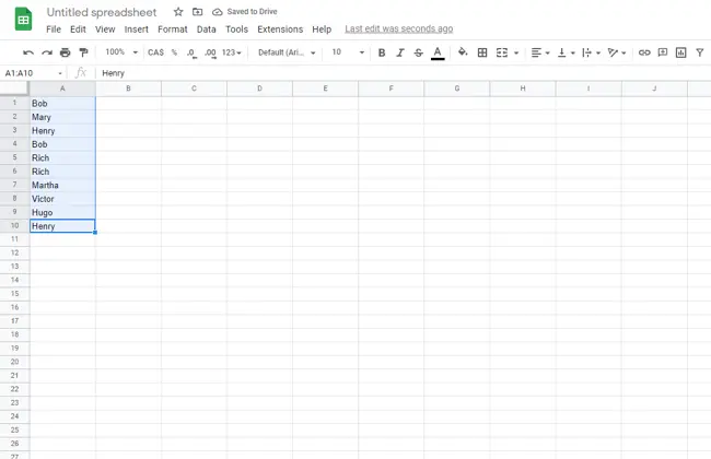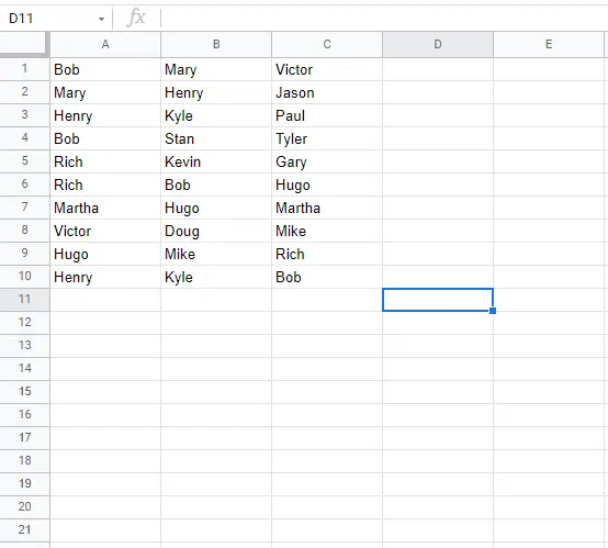 Вы также можете выделить дубликаты в нескольких строках и столбцах, если у вас большой набор данных. Процесс начинается так же, как и выше, но в меню «Правила условного формата» вы вводите расширенный диапазон данных, чтобы учесть все ячейки, которые вы хотите сравнить. В качестве отправной точки я использую тот же пример, что и выше, но добавлю еще несколько имен, поэтому мы используем формулу для поиска по трем столбцам: A, B и C, а также по строкам 1-10.