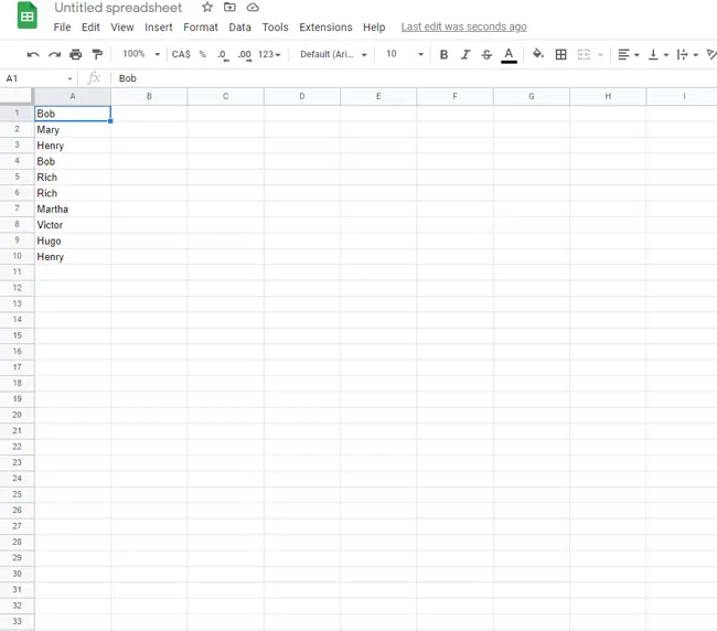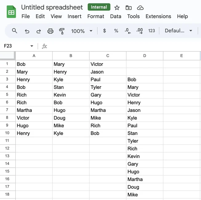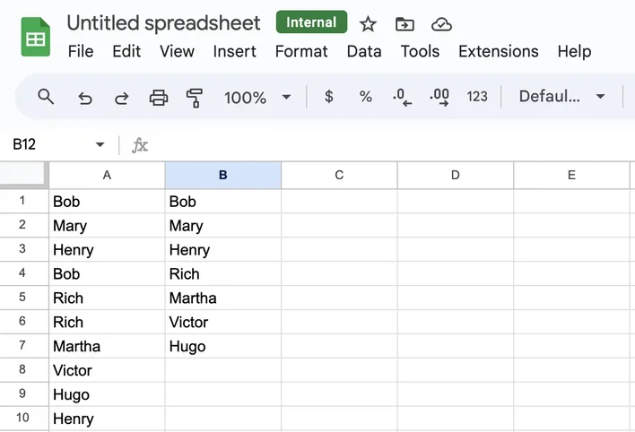 Недостатком использования функции UNIQUE для поиска дубликатов в Google Sheets является то, что вместо выделения и удаления дубликатов она выдает отдельный список без дубликатов. Это создает дополнительный шаг, поскольку вам придется вручную удалять дубликаты, используя новый список в качестве ссылки, поэтому я рекомендую этот метод для тех, у кого небольшой набор данных и кто не против нескольких ручных обновлений. Кроме того, этот метод — отличный вариант для составления чистого списка, чтобы начать с чистого листа.