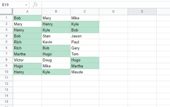 Это позволит выделить все дубликаты во всех трех столбцах и всех десяти строках, что облегчит поиск двойников данных: