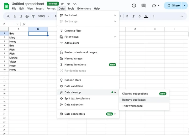 Помимо выделения дубликатов, вы также можете использовать Google Sheets для удаления дубликатов с помощью функции очистки данных. Ниже я покажу вам, как это сделать.