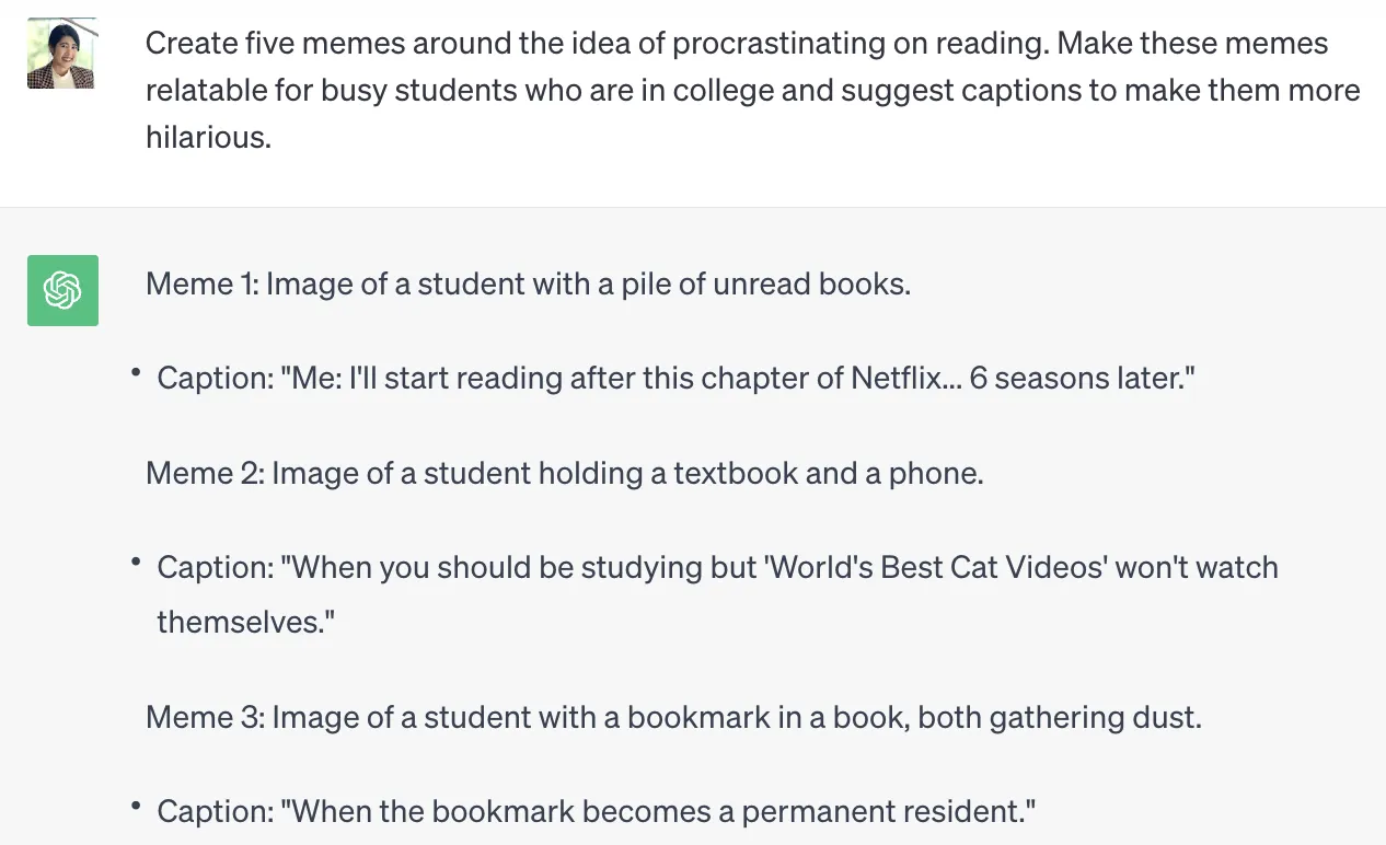 Создайте пять мемов на тему [объясните свою идею]. Сделайте эти мемы доступными для [целевой аудитории] и предложите подписи, чтобы сделать их более уморительными.
