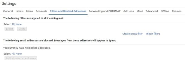 2. Перейдите к разделу «Фильтры и заблокированные адреса» в верхнем меню.