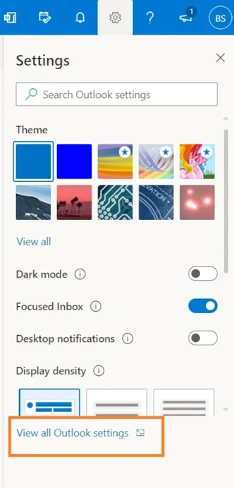 1. Нажмите значок шестеренки в Outlook и выберите «Просмотр всех настроек Outlook».