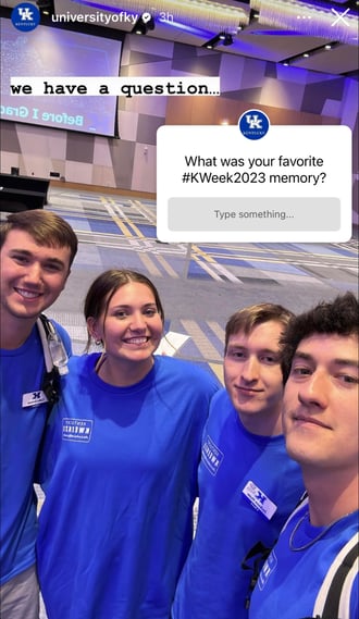 Разговорный маркетинг использует интерактивный подход для вовлечения аудитории в реальном времени. В контексте высшего образования, где потенциальные студенты хотят получить индивидуальный опыт и немедленный ответ, эта стратегия является эффективным способом достижения обеих целей. Например, Университет Кентукки взаимодействует со студентами в социальных сетях, публикуя опросы и вопросы в Instagram Stories. Используя эти интерактивные функции, университет вовлекает свою аудиторию в беседы о жизни кампуса, академических предпочтениях и многом другом.