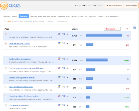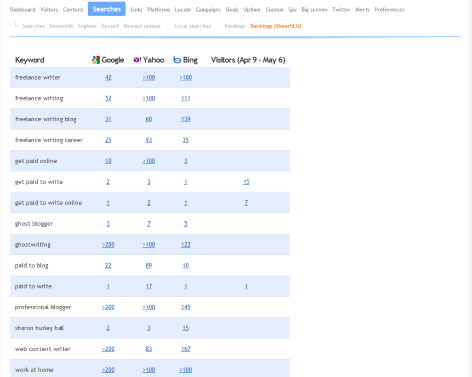 В разделе контента вы можете получить эквивалент отчета Clicky о потоке посетителей Google, показывающий, откуда люди пришли и куда они направились дальше. Интерфейс поиска показывает рейтинг Google для любой из ваших страниц, занимающих первое место в рейтинге. Clicky также предоставляет данные от Sheer SEO по вашим запросам, занимающим верхние строчки в основных поисковых системах. Это может быть полезно для тех, кто скорбит о потере данных о ключевых словах.