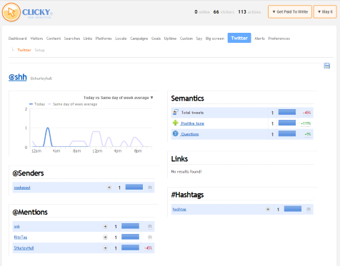 Еще одна интересная функция — Clicky автоматически отслеживает определенные события RSS как кампании. К ним относятся посты CoSchedule, акции Buffer и данные email-рассылки. Эти динамические кампании не требуют настройки. Clicky также поддерживает динамические цели и сплит-тестирование. Кроме того, он может отслеживать некоторые данные вашего аккаунта в Twitter — функция, которая появилась задолго до того, как Twitter выпустил свою собственную аналитику. Хотя я не верю, что данные Clicky совпадают с реальной активностью на моем аккаунте в Twitter, это приятно иметь.