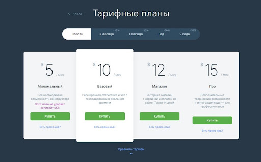 Цены тарифов в uKit тем ниже, чем длительнее период оплаты. Максимальная цена получается при оплате за 1 месяц, дальше она снижается на 5, 10, 20 и 30 процентов, если покупаете на 3, 6, 12 и 24 месяца вперёд соответственно. Периодически проскакивают солидные скидки, также без труда в Сети находятся промо-коды, снижающие стоимость на 25%. Базовые цены при оплате за месяц:
