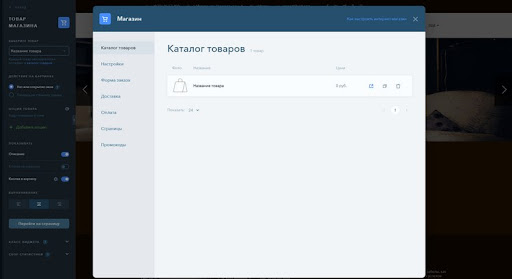 В редакторе есть два виджета, позволяющих запустить магазин – встроенный «Товар магазина» и внешний плагин Ecwid. Второй мощнее на порядок – там больше настроек, всё есть, что ожидаешь увидеть от профильного магазинного движка. Встроенный прост в управлении, позволяет добавить неограниченное количество товаров/услуг на продажу, настроить корзину, форму заказа, варианты доставки и оплаты. Есть менеджер товаров с фильтрацией, импорта/экспорта из CSV нет, поэтому с большой витриной работать трудно.