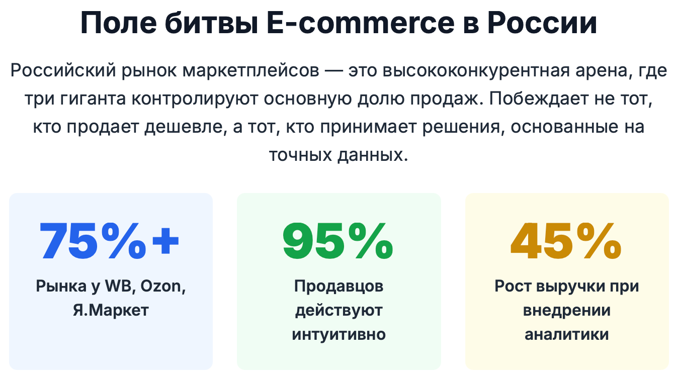 Российский рынок электронной коммерции переживает эпоху беспрецедентного роста, локомотивами которого стали три титана: Wildberries, Ozon и Яндекс.Маркет. Совокупно они аккумулируют львиную долю онлайн-продаж в стране, привлекая сотни тысяч продавцов и десятки миллионов покупателей.1 Эта концентрация рынка создала уникальную среду — гиперконкурентную арену, где успех или провал бизнеса решаются за считанные недели, а иногда и дни.