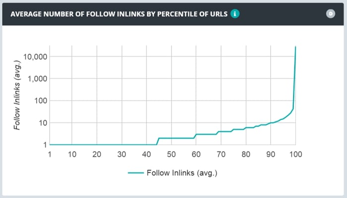 Вполне нормально, что некоторые URL-адреса имеют больше входящих ссылок. Например, если у вас сайт электронной коммерции, каждая страница товара в категории «Юбки» будет ссылаться на обзорную страницу «Юбки». Это хорошо: это говорит Google о том, что ваши URL верхнего уровня являются наиболее важными (что помогает им ранжироваться выше). Однако сильно перекошенное соотношение распределения ссылок не является идеальным. Если крошечный процент ваших URL-адресов получает гораздо больше ссылок, чем остальные, то 95% будет трудно получить поисковый трафик — вы не передаете им достаточно авторитета. Вот как выглядит сильно перекошенное распределение:
