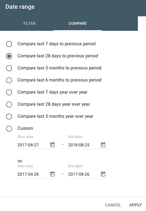 Нажмите «Диапазон дат», чтобы изменить даты, а затем выберите вкладку «Сравнить».