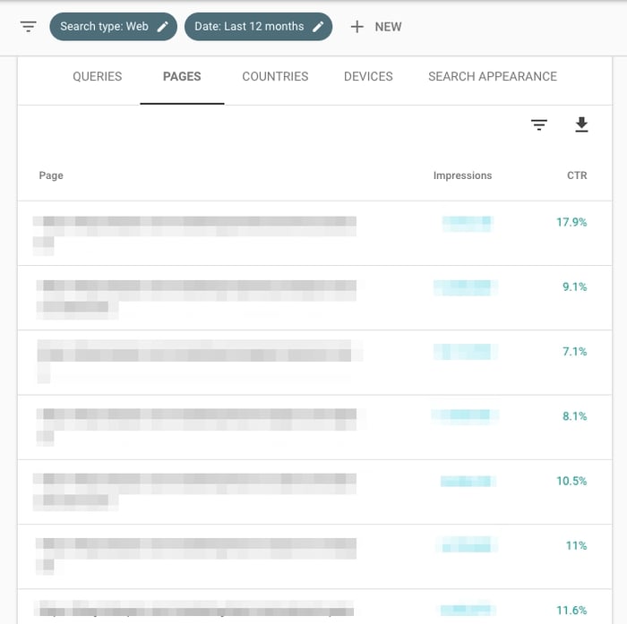 На этом этапе вы можете просмотреть данные в GSC или экспортировать их. Для глубокого анализа я настоятельно рекомендую второе — это значительно облегчит вам жизнь. Для этого нажмите стрелку вниз под надписью «Внешний вид поиска», затем загрузите его в CSV-файл или экспортируйте в Google Sheets.