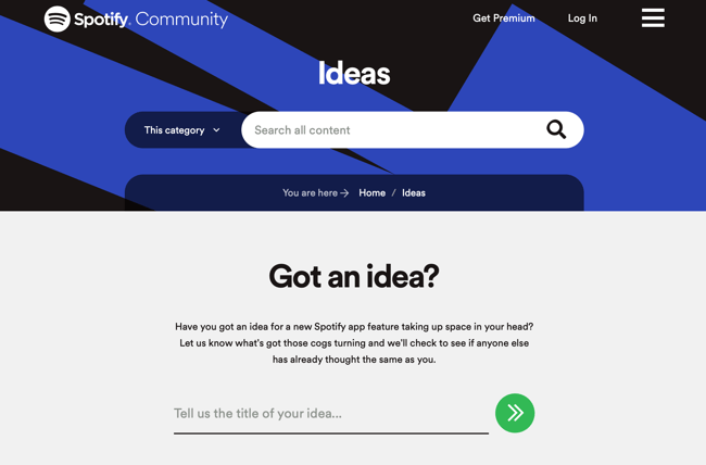 Такой тип управления сообществом подходит всем компаниям — запрос отзывов реальных клиентов и пользователей об инновационных возможностях имеет решающее значение для успеха. Но он особенно полезен для SaaS-компаний, ориентированных на потребителя, где ошибки иногда могут перерасти в проблему управления репутацией. Форум сообщества Spotify — отличный пример. На нем пользователи могут не только обсуждать музыку, но и предлагать идеи продуктов для рассмотрения командой Spotify.