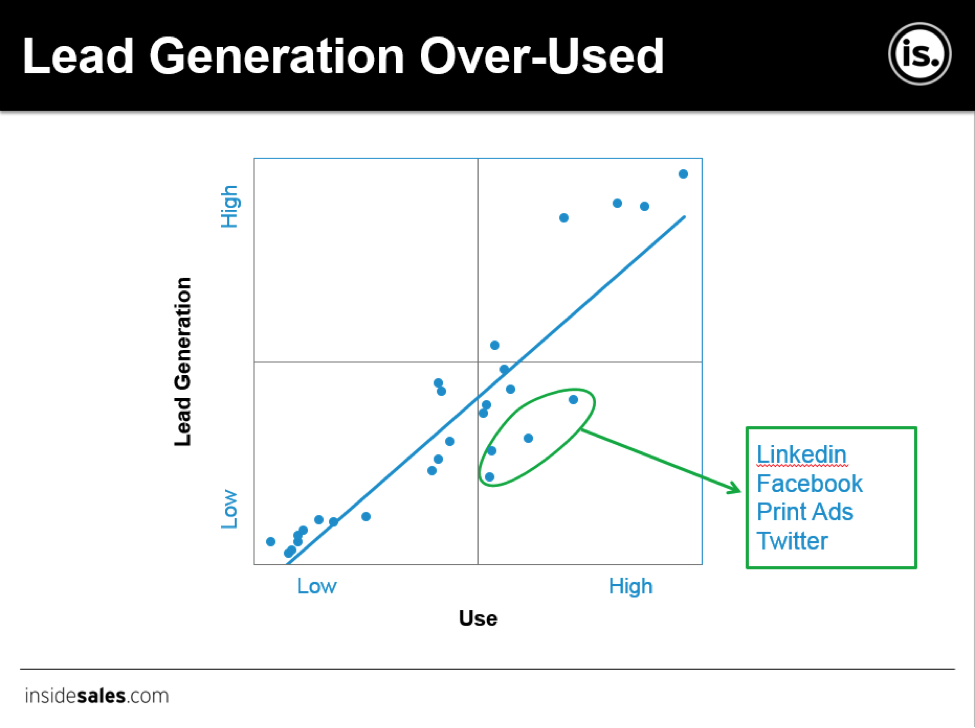 В статье Forbes от 2013 года было сделано смелое заявление о том, что «Twitter — самый сильный канал социальных сетей для генерации лидов в бизнесе (B2B) «. Далее в статье не приводилось никаких доказательств, кроме уклончивой ссылки на «недавнее исследование». Меня больше интересуют факты, чем чьи-то беспочвенные утверждения. InsideSales.com обнаружил, что в квадранте методов генерации лидов социальные медиа имеют низкую эффективность, но высокую степень использования: