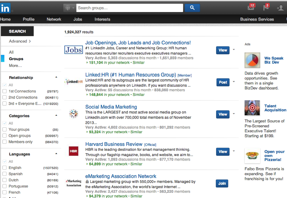 Присоединяйтесь к группам. В LinkedIn существует огромное количество групп, к которым вы можете присоединиться. Вы легко найдете группу, в которой собраны профессионалы, которые, скорее всего, станут вашими потенциальными клиентами. Вот моя страница группы в LinkedIn. Похоже, там почти 2 миллиона групп, к которым я могу присоединиться (1 924 327).