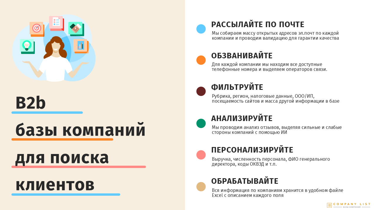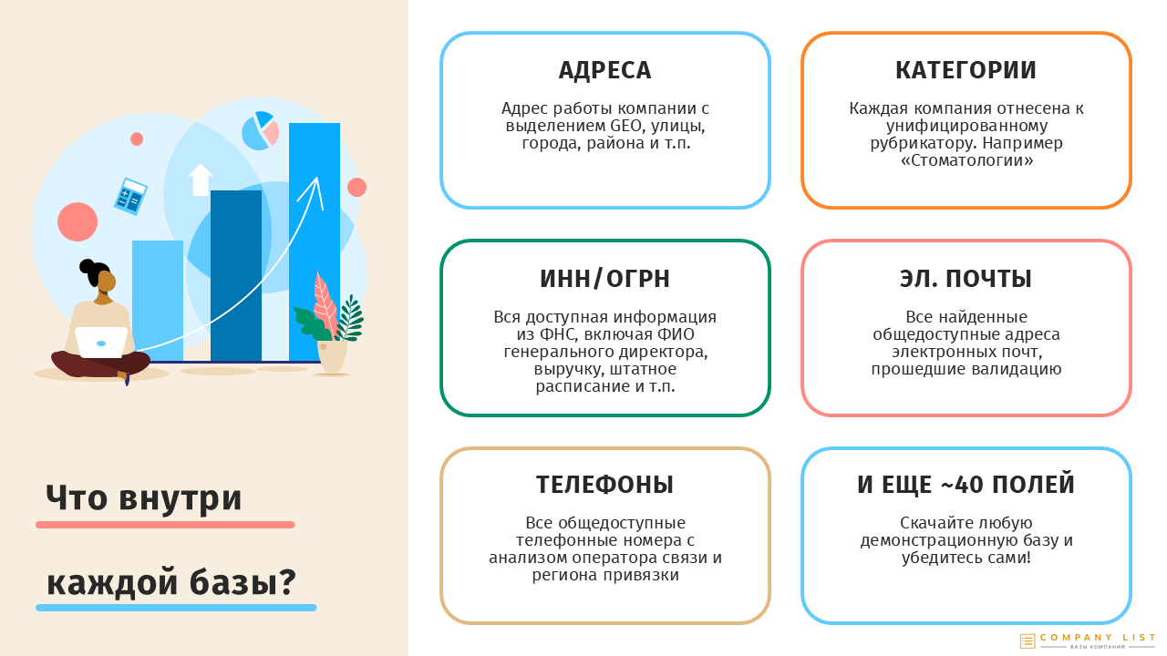 Эта база данных может стать незаменимым инструментом для продаж, маркетинга и стратегического планирования. С ее помощью вы сможете сегментировать аудиторию, планировать целевые кампании и улучшать процессы взаимодействия с клиентами. Она особенно полезна для компаний, которые планируют выйти на рынок маркетплейсов или уже работают в этой сфере и стремятся усилить свои позиции. Чтобы оценить актуальность и ценность этих данных, мы предлагаем бесплатно скачать демо-версию базы, которая даст вам возможность заранее оценить уникальность и пригодность информации для ваших бизнес-задач в формате Excel с эл. почтами, телефонами, налоговыми данными, сайтами, рейтингом и другой информацией. Скачайте демо версию, чтобы оценить качество и количество данных. Первые три строки в демо версии содержат полные данные.