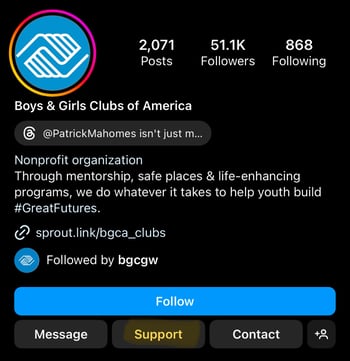 Инструменты для конкретной платформы: Большинство каналов, включая Facebook и Instagram, предлагают встроенные инструменты для сбора средств для некоммерческих организаций. Например, вы можете легко добавить кнопку «Поддержать» в свой профиль или кликабельный стикер «Пожертвовать» в свою историю.