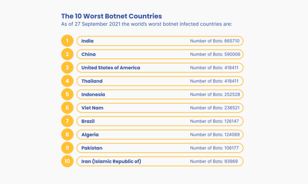 По данным Spamhaus Project, в настоящее время по количеству ботнетов (665 710) в мире лидирует Индия, за ней следуют Китай и США.