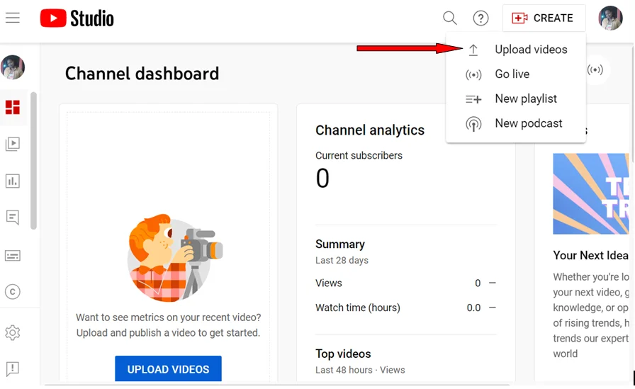 Нажмите на кнопку «Создать» в студии YouTube и выберите «Загрузить видео».