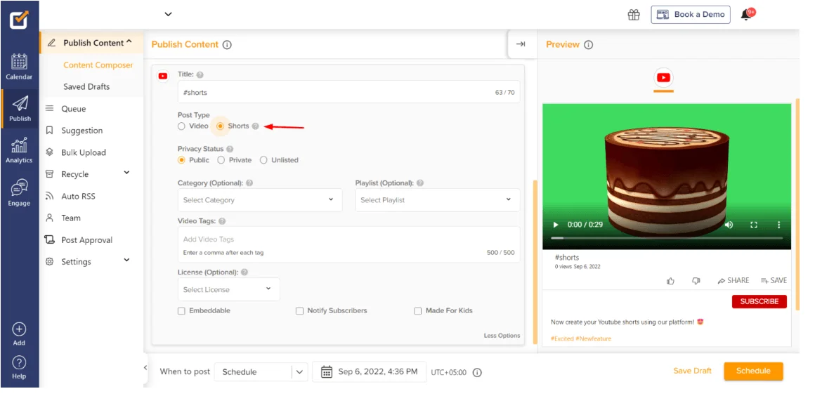 Social Champ предоставляет функцию планирования YouTube Shorts, позволяя вам планировать и публиковать контент Shorts в определенное время.